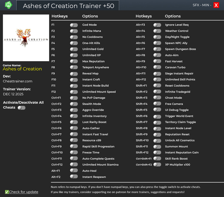 Our Ashes of Creation +50 trainer is now available for free download. These Ashes of Creation cheats are designed to enhance your experience with the game.