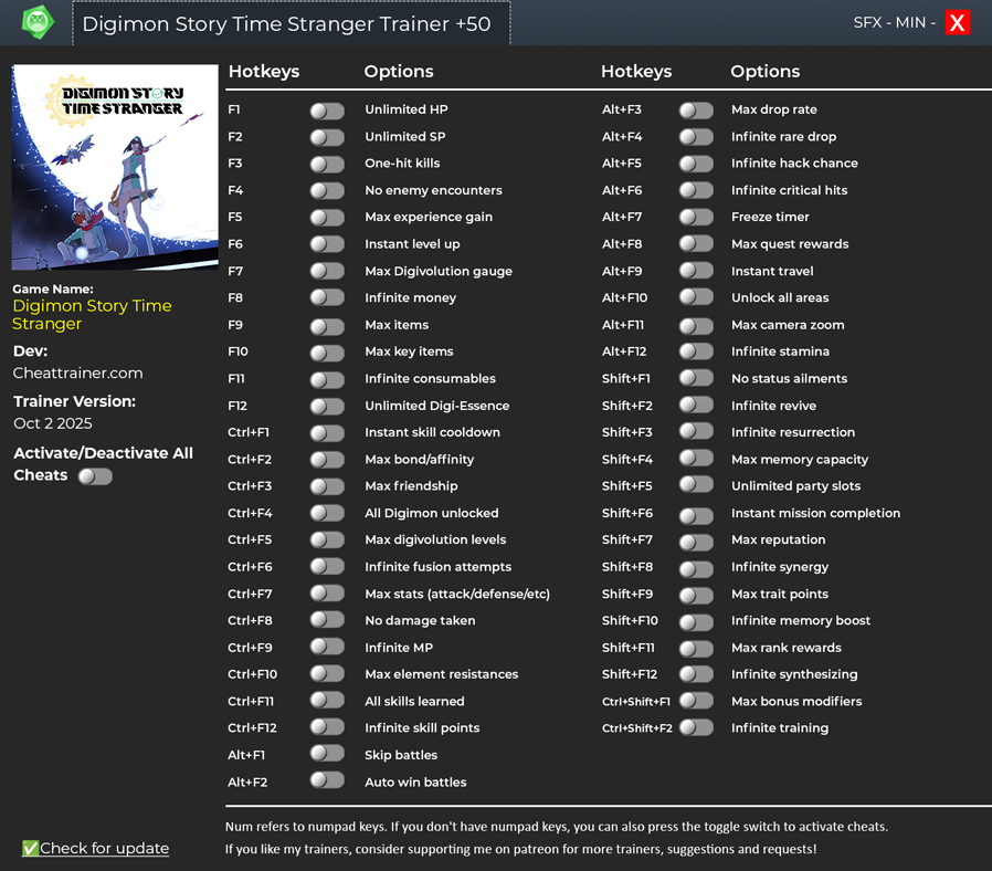 Download the latest Digimon Story Time Stranger Trainer with over 50 powerful cheats and hacks. Unlimited HP, One-hit kills, Auto win battles and much more. 100% free, safe, and updated for 2025.