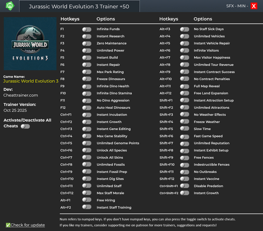 Our Jurassic World Evolution 3 +50 trainer is now available for free download. These Jurassic World Evolution 3 cheats are designed to enhance your experience with the game.